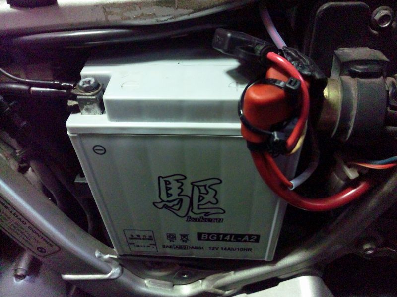 このバッテリーの取り付けには純正の保護ケースを取り外して変わりにクッションシートを下に引いています、マイナスはなにもしないでも取り付けれますがプラスは少し工夫が必要で私は手持ちの変換端子を使用(A2端子をA端子として使用する物を逆に使用)短絡が怖いのでリレーとの間には融着テープの厚みの有る物を挟みタイラップで押さえています。