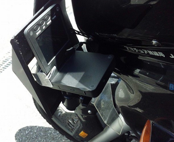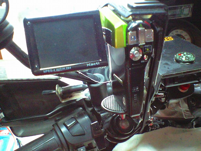 左のミラーの所の液晶がザクティの物で走行中に操作も出来ますが唯一外部電源に対応してない型の物を手に入れたので内蔵バッテリーが終わると入れ替えの必要がある(結構不便です)