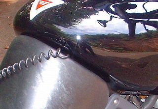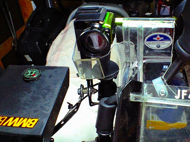:現在はザクティCG65をこのようにミラーと共締めで取り付けて少しでもぶれを少なくするために色々とステーを工夫しています、又クリヤな物はアクリルサンデーなどでカメラの防御や風切り音などの対策でレンズも自作のワイコンを使い保護の為にPLフィルターも使用。