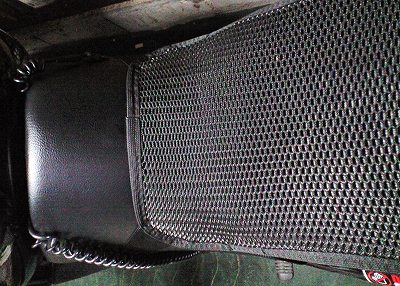 この様なシートカバーは市販されている物が当時は無かったので友人のアイデアで出来上がりました、網の様な物は登山用品屋でリュックなどの背あてとして有る物でそれにバンドを縫いつけてシート裏にマジックテープで貼り付けています。
